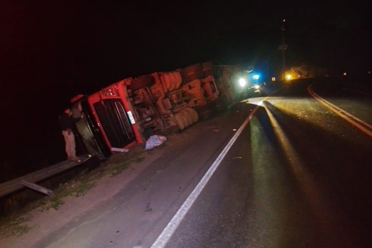Uma carreta tombou no km 770 da BR-116, em Leopoldina, na noite deste Domingo (28).