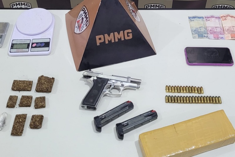 Após a abordagem, os policiais realizaram diligências na residência da mãe do suspeito, onde localizaram uma pistola calibre .380, dois carregadores, 32 munições intactas, uma barra e porções menores de maconha, duas balanças de precisão, material utilizado para embalar drogas e um aparelho celular.