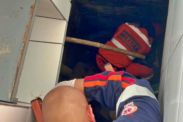 Com o colapso do piso, a vítima caiu em um local de difícil acesso e sofreu ferimentos graves nas duas pernas. Os bombeiros realizaram a retirada da idosa do ambiente confinado utilizando técnicas de salvamento em altura, garantindo a segurança durante o resgate.