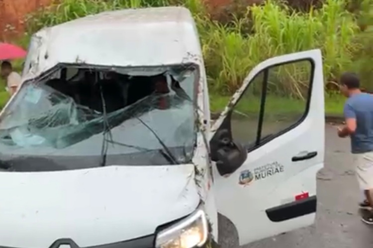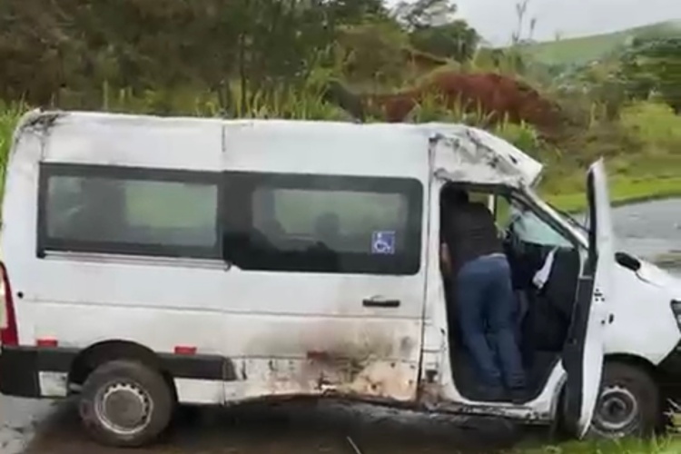 Uma van da Prefeitura de Muriaé se envolveu em um acidente nesta quarta-feira entre Leopoldina e Juiz de Fora. O veículo saiu da pista e capotou em um trecho estreito da via, que estava com a pista molhada e capim alto nas margens.